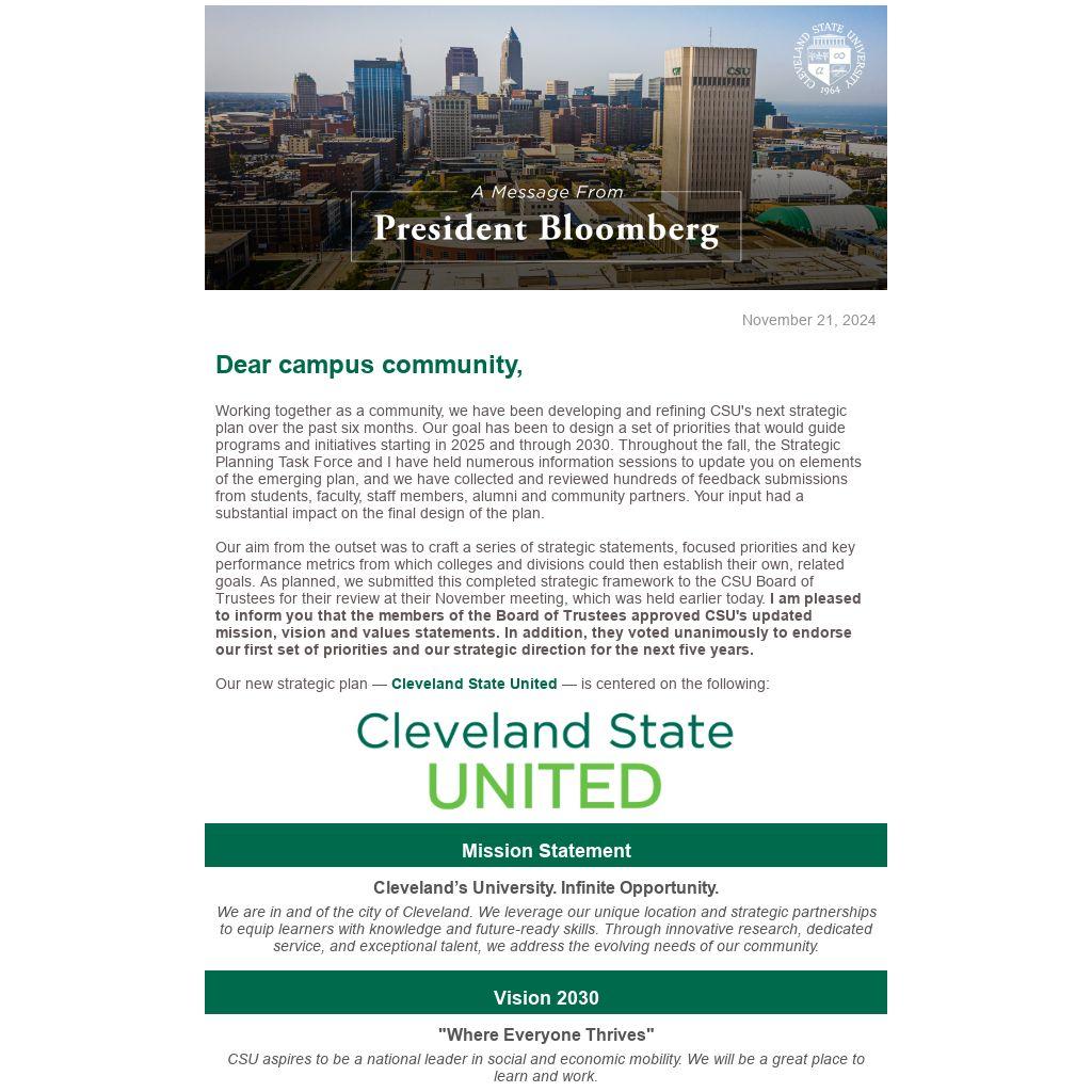 We will hold a Cleveland State United launch event in January 2025, after the start of the spring semester to share further detail on this new plan and the metrics we will monitor to track our progress.