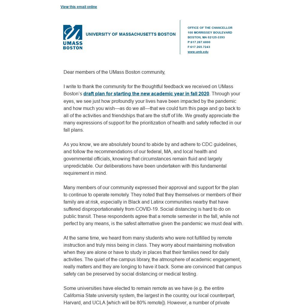 I write to thank the community for the thoughtful feedback we received on UMass Boston’s draft plan for starting the new academic year in fall 2020. Through your eyes, we see just how profoundly your lives have been impacted by the pandemic and how much you wish—as do we all—that we could turn this page and go back to all of the activities and friendships that are the stuff of life. We greatly appreciate the many expressions of support for the prioritization of health and safety reflected in our fall plans.
