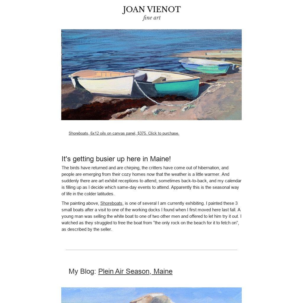 The painting above, Shoreboats, is one of several I am currently exhibiting. I painted these 3 small boats after a visit to one of the working docks I found when I first moved here last fall. A young man was selling the white boat to one of two other men and offered to let him try it out. I watched as they struggled to free the boat from “the only rock on the beach for it to fetch on”, as described by the seller.