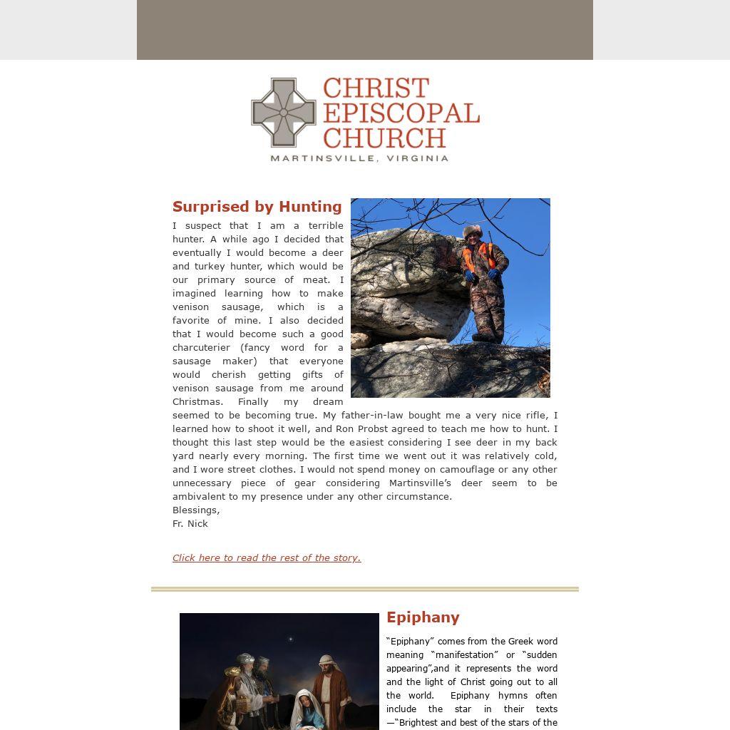 “Epiphany” comes from the Greek word meaning “manifestation” or “sudden appearing”,and it represents the word and the light of Christ going out to all the world. Epiphany hymns often include the star in their texts—“Brightest and best of the stars of the morning”, “What star is this with beams so bright”, “How bright appears the morning star”, to name a few. But no hymn represents Epiphany better than “We three kings of orient are”. The three kings who followed the star are the first “foreigners” to whom the light of Christ is revealed. The western Christian Church has, since the first century, believed that there were only three kings, or wise men. The Syrian Christian Church at that time counted as many as twelve!