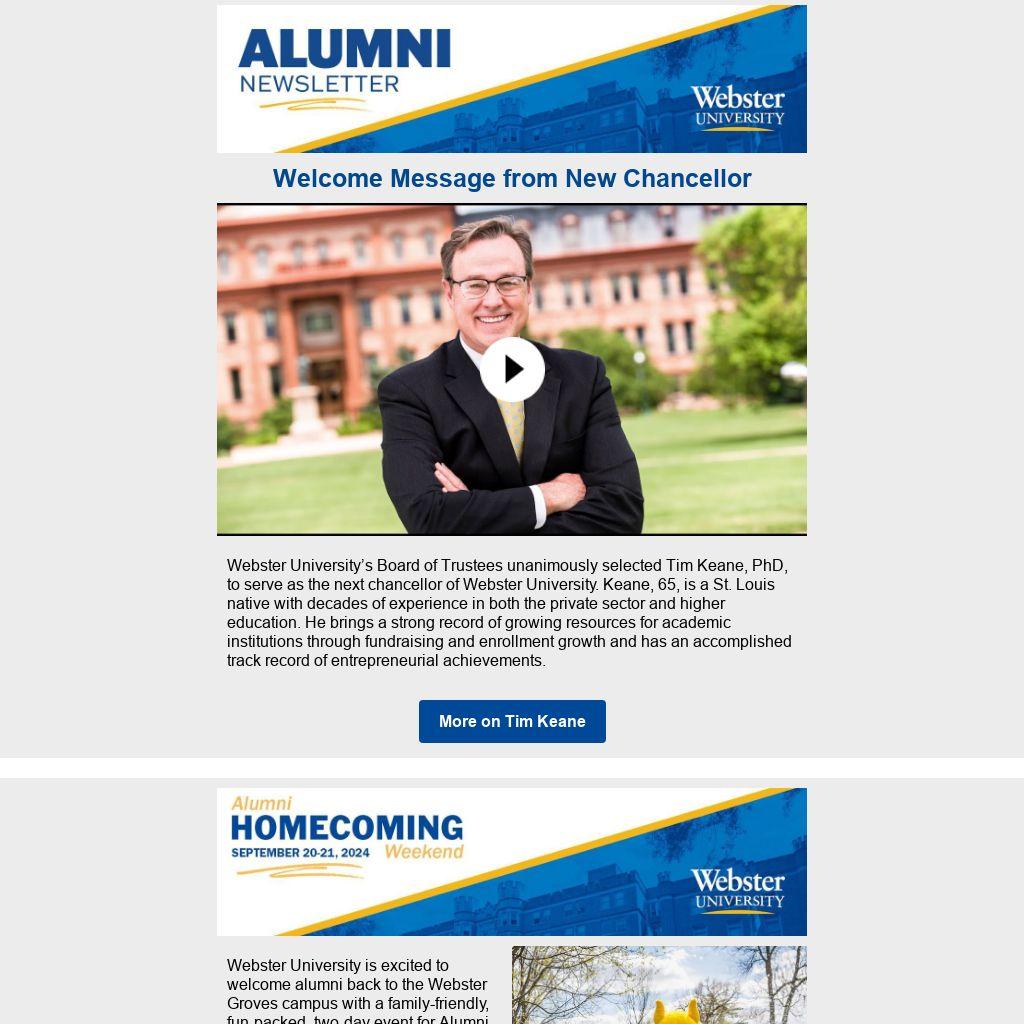 Webster University’s Board of Trustees unanimously selected Tim Keane, PhD, to serve as the next chancellor of Webster University. Keane, 65, is a St. Louis native with decades of experience in both the private sector and higher education. He brings a strong record of growing resources for academic institutions through fundraising and enrollment growth and has an accomplished track record of entrepreneurial achievements.