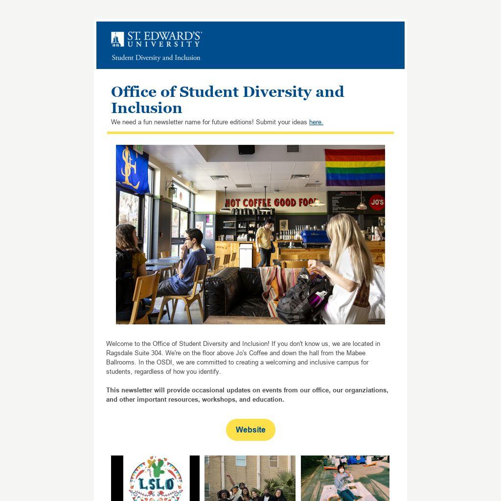 Welcome to the Office of Student Diversity and Inclusion! If you don't know us, we are located in Ragsdale Suite 304. We're on the floor above Jo's Coffee and down the hall from the Mabee Ballrooms. In the OSDI, we are committed to creating a welcoming and inclusive campus for students, regardless of how you identify.