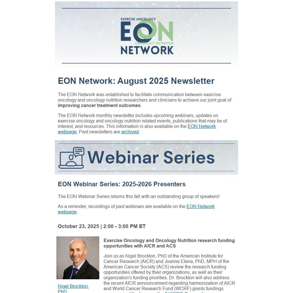 The EON Network monthly newsletter includes upcoming webinars, updates on exercise oncology and oncology nutrition related events, publications that may be of interest, and resources. This information is also available on the EON Network webpage. Past newsletters are archived.