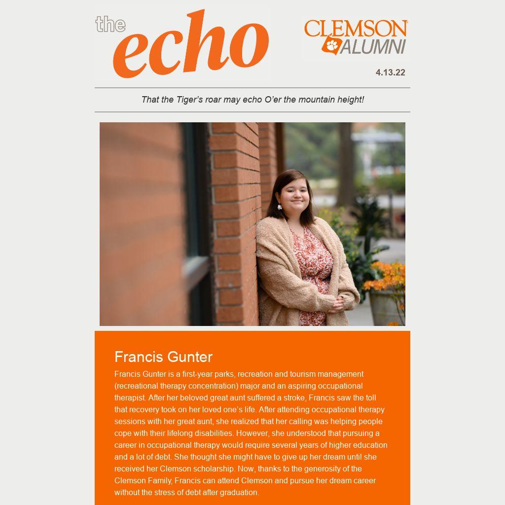 Francis Gunter is a first-year parks, recreation and tourism management (recreational therapy concentration) major and an aspiring occupational therapist. After her beloved great aunt suffered a stroke, Francis saw the toll that recovery took on her loved one’s life. After attending occupational therapy sessions with her great aunt, she realized that her calling was helping people cope with their lifelong disabilities. However, she understood that pursuing a career in occupational therapy would require several years of higher education and a lot of debt. She thought she might have to give up her dream until she received her Clemson scholarship. Now, thanks to the generosity of the Clemson Family, Francis can attend Clemson and pursue her dream career without the stress of debt after graduation.