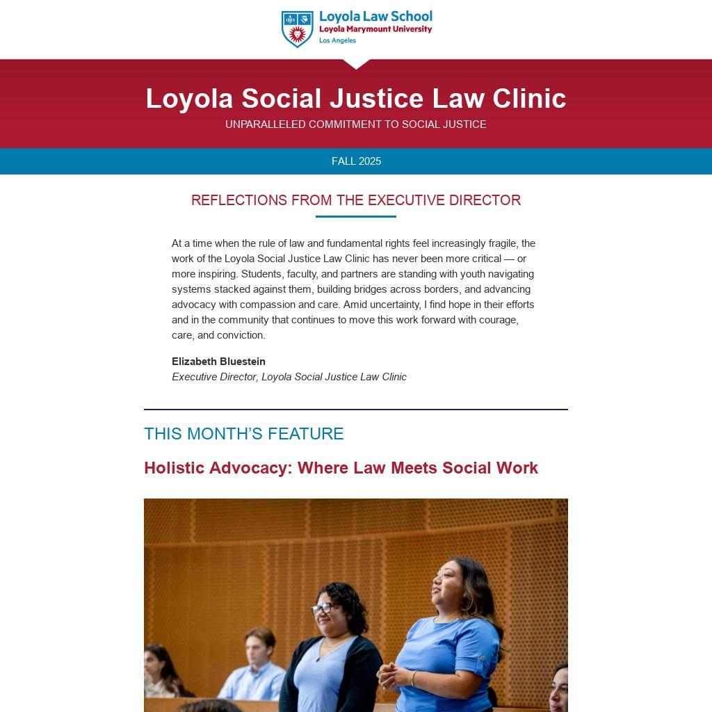 At a time when the rule of law and fundamental rights feel increasingly fragile, the work of the Loyola Social Justice Law Clinic has never been more critical — or more inspiring. Students, faculty, and partners are standing with youth navigating systems stacked against them, building bridges across borders, and advancing advocacy with compassion and care. Amid uncertainty, I find hope in their efforts and in the community that continues to move this work forward with courage, care, and conviction.