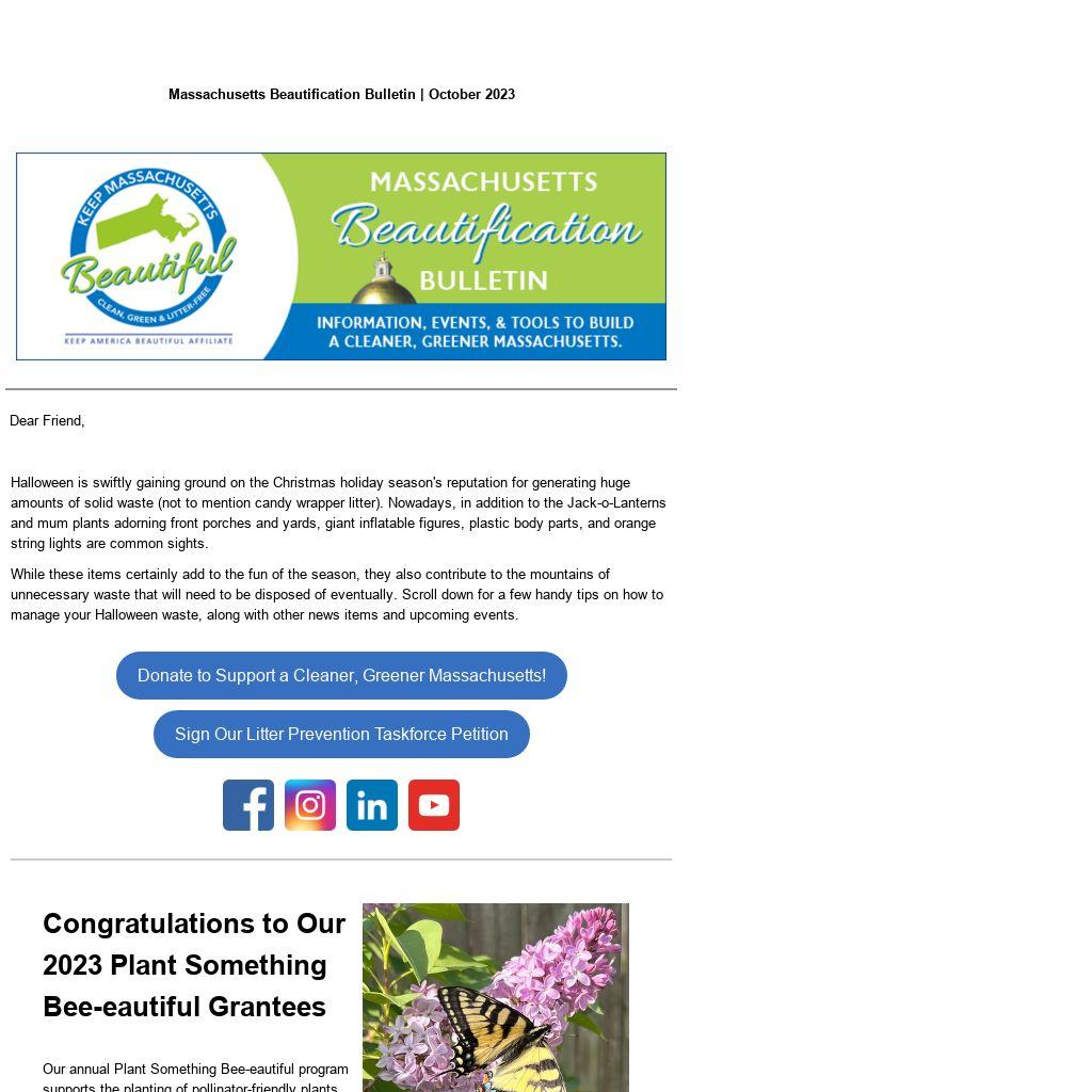 Representatives from Keep Framingham Beautiful will share some of the ideas that have worked incredibly well in their community. We’ll also reserve 15 minutes at the end for an open-ended Q&A session.