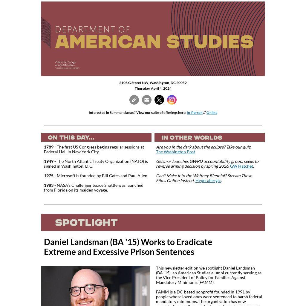| This newsletter edition we spotlight Daniel Landsman (BA ‘15), an American Studies alumni currently serving as the Vice President of Policy for Families Against Mandatory Minimums (FAMM).
