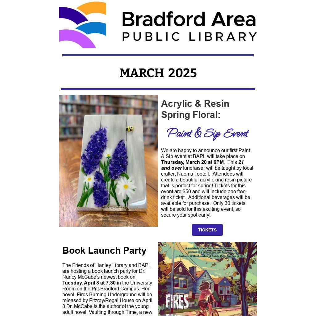 We are happy to announce our first Paint & Sip event at BAPL will take place on Thursday, March 20 at 6PM. This 21 and over fundraiser will be taught by local crafter, Naoma Tootell. Attendees will create a beautiful acrylic and resin picture that is perfect for spring! Tickets for this event are $50 and will include one free drink ticket. Additional beverages will be available for purchase. Only 30 tickets will be sold for this exciting event, so secure your spot early!
