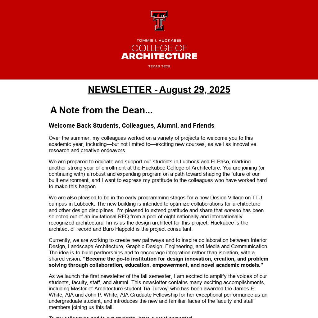 We are prepared to educate and support our students in Lubbock and El Paso, marking another strong year of enrollment at the Huckabee College of Architecture. You are joining (or continuing with) a robust and expanding program on a path toward shaping the future of our built environment, and I want to express my gratitude to the colleagues who have worked hard to make this happen.