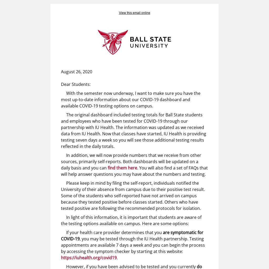 - Now that the semester has started, the University is working to provide additional testing options on campus, including a walk-in testing option. The appointments are first come, first serve and will be available for Ball State University students at Scheumann Stadium on the following days: