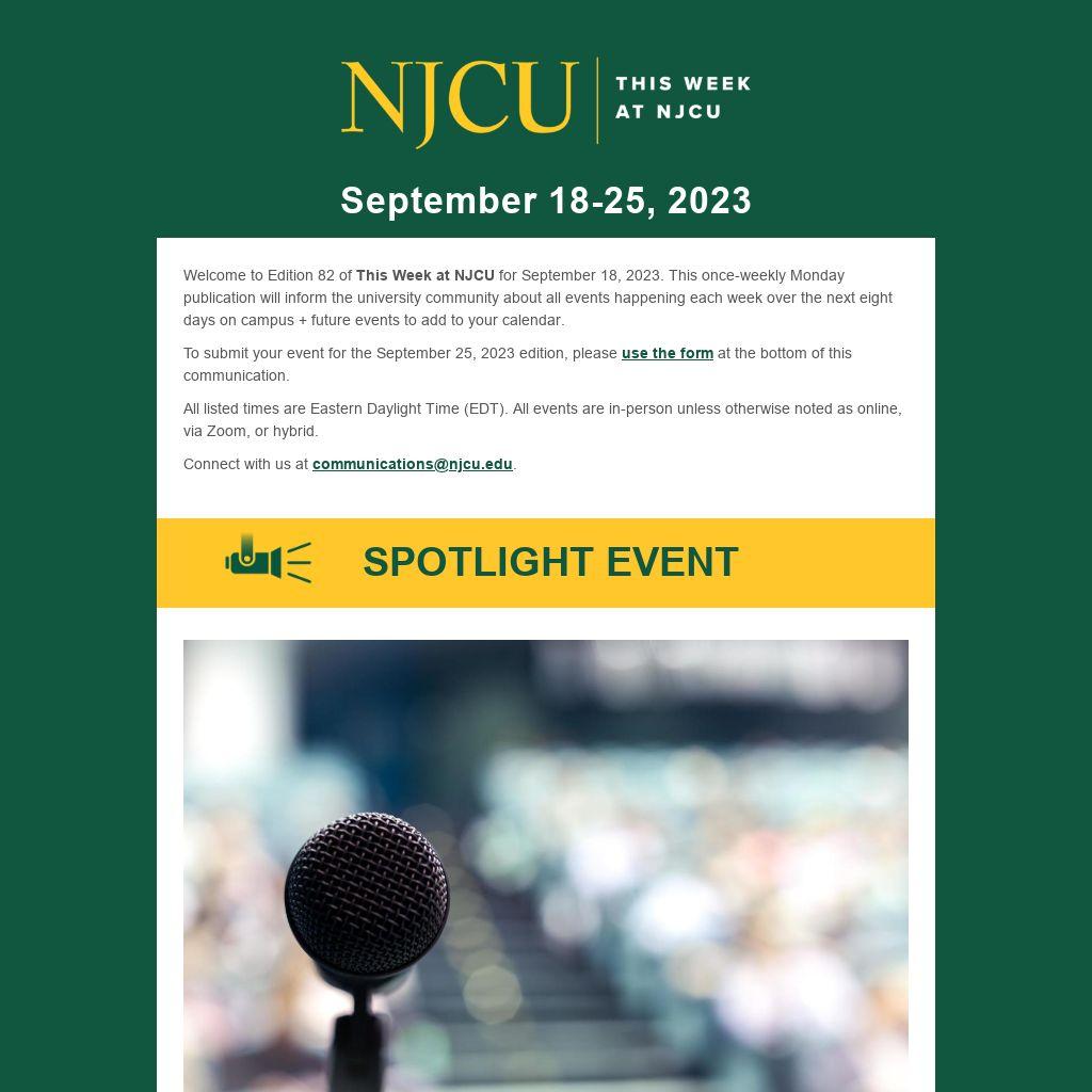 Welcome to Edition 82 of This Week at NJCU for September 18, 2023. This once-weekly Monday publication will inform the university community about all events happening each week over the next eight days on campus + future events to add to your calendar.