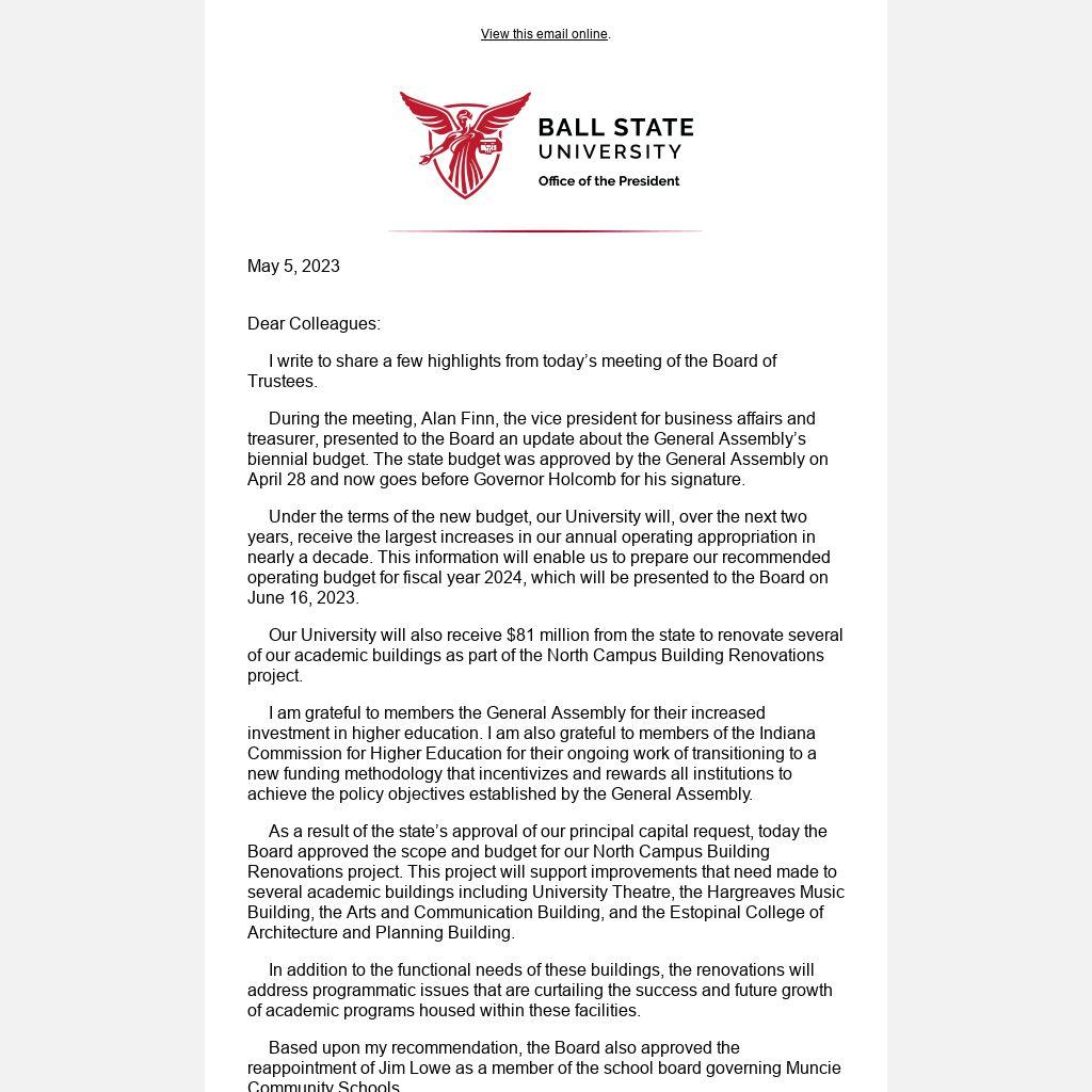 Under the terms of the new budget, our University will, over the next two years, receive the largest increases in our annual operating appropriation in nearly a decade. This information will enable us to prepare our recommended operating budget for fiscal year 2024, which will be presented to the Board on June 16, 2023.