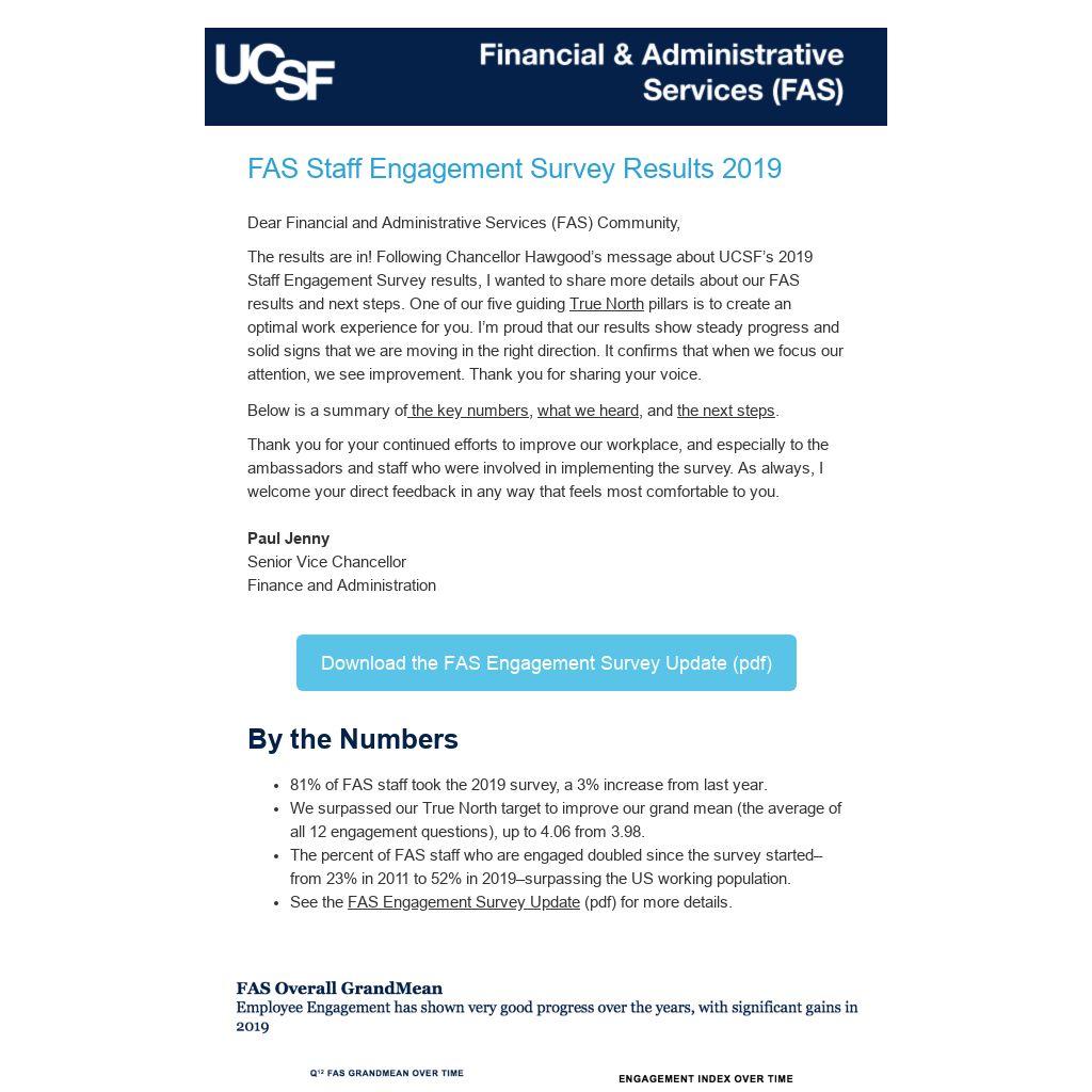 The results are in! Following Chancellor Hawgood’s message about UCSF’s 2019 Staff Engagement Survey results, I wanted to share more details about our FAS results and next steps. One of our five guiding True North pillars is to create an optimal work experience for you. I’m proud that our results show steady progress and solid signs that we are moving in the right direction. It confirms that when we focus our attention, we see improvement. Thank you for sharing your voice.