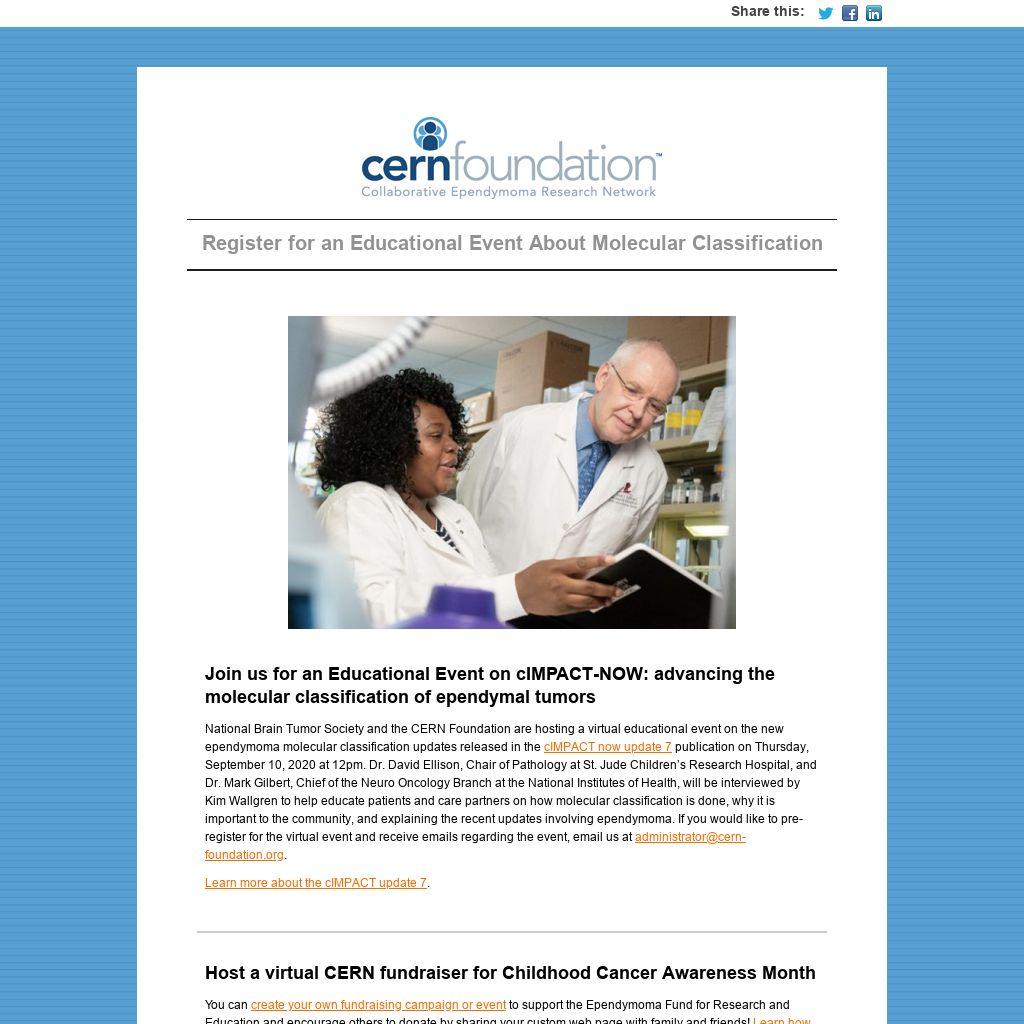 National Brain Tumor Society and the CERN Foundation are hosting a virtual educational event on the new ependymoma molecular classification updates released in the
