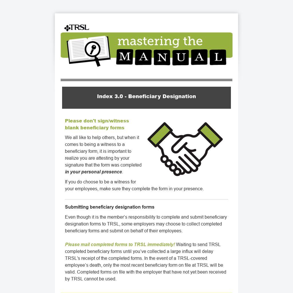 Even though it is the member’s responsibility to complete and submit beneficiary designation forms to TRSL, some employers may choose to collect completed beneficiary forms and submit on behalf of their employees.
