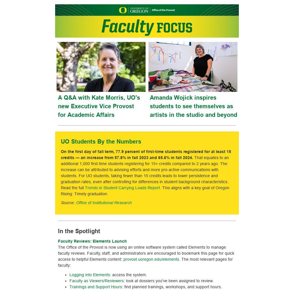 The Office of the Provost is now using an online software system called Elements to manage faculty reviews. Faculty, staff, and administrators are encouraged to bookmark this page for quick access to helpful Elements content: provost.uoregon.edu/elements. The most relevant pages for faculty: