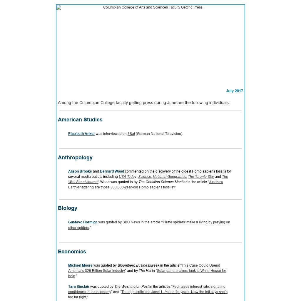 | | Among the Columbian College faculty getting press during June are the following individuals: