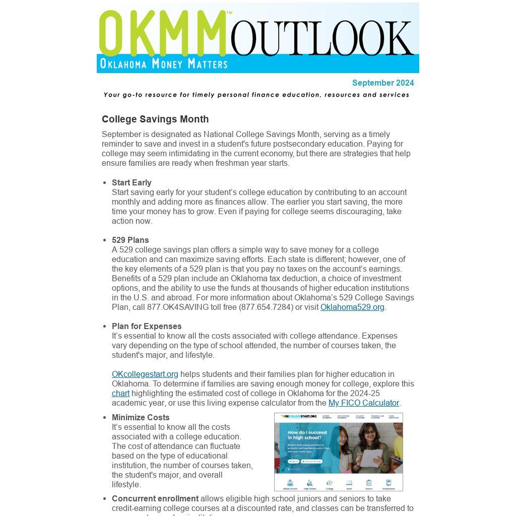 OKcollegestart.org helps students and their families plan for higher education in Oklahoma. To determine if families are saving enough money for college, explore this chart highlighting the estimated cost of college in Oklahoma for the 2024-25 academic year, or use this living expense calculator from the My FICO Calculator.