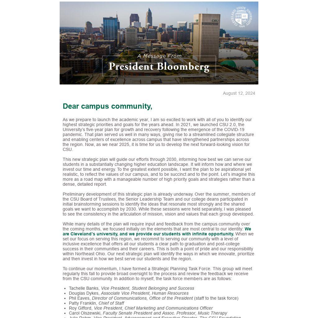 To continue our momentum, I have formed a Strategic Planning Task Force. This group will meet regularly this fall to provide broad oversight to the process and review the feedback we receive from the CSU community. In addition to myself, the task force members are as follows: