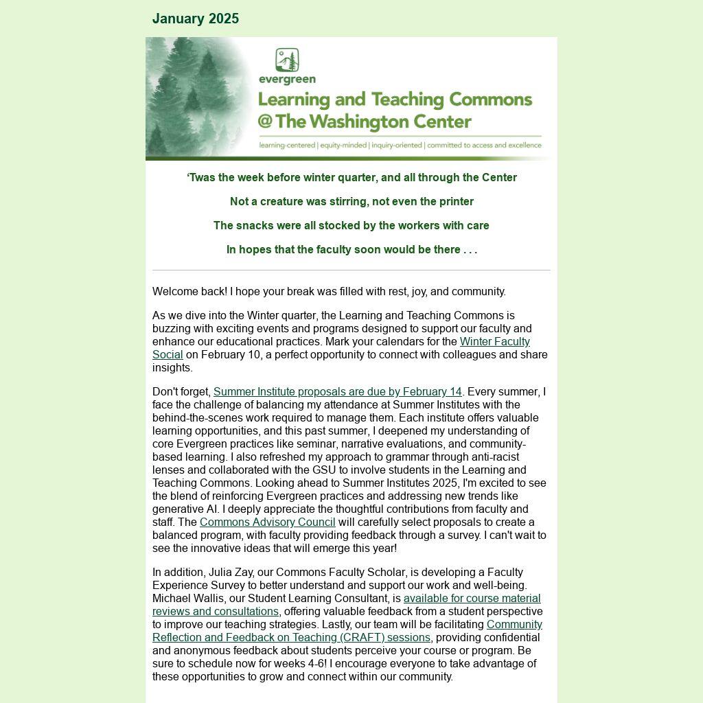 Don't forget, Summer Institute proposals are due by February 14. Every summer, I face the challenge of balancing my attendance at Summer Institutes with the behind-the-scenes work required to manage them. Each institute offers valuable learning opportunities, and this past summer, I deepened my understanding of core Evergreen practices like seminar, narrative evaluations, and community-based learning. I also refreshed my approach to grammar through anti-racist lenses and collaborated with the GSU to involve students in the Learning and Teaching Commons. Looking ahead to Summer Institutes 2025, I'm excited to see the blend of reinforcing Evergreen practices and addressing new trends like generative AI. I deeply appreciate the thoughtful contributions from faculty and staff. The Commons Advisory Council will carefully select proposals to create a balanced program, with faculty providing feedback through a survey. I can't wait to see the innovative ideas that will emerge this year!
