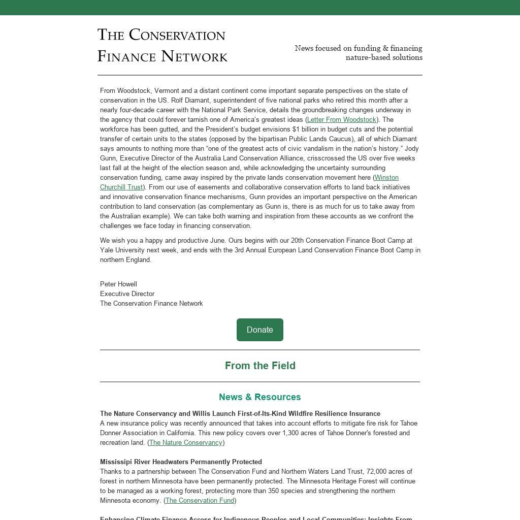 We wish you a happy and productive June. Ours begins with our 20th Conservation Finance Boot Camp at Yale University next week, and ends with the 3rd Annual European Land Conservation Finance Boot Camp in northern England.