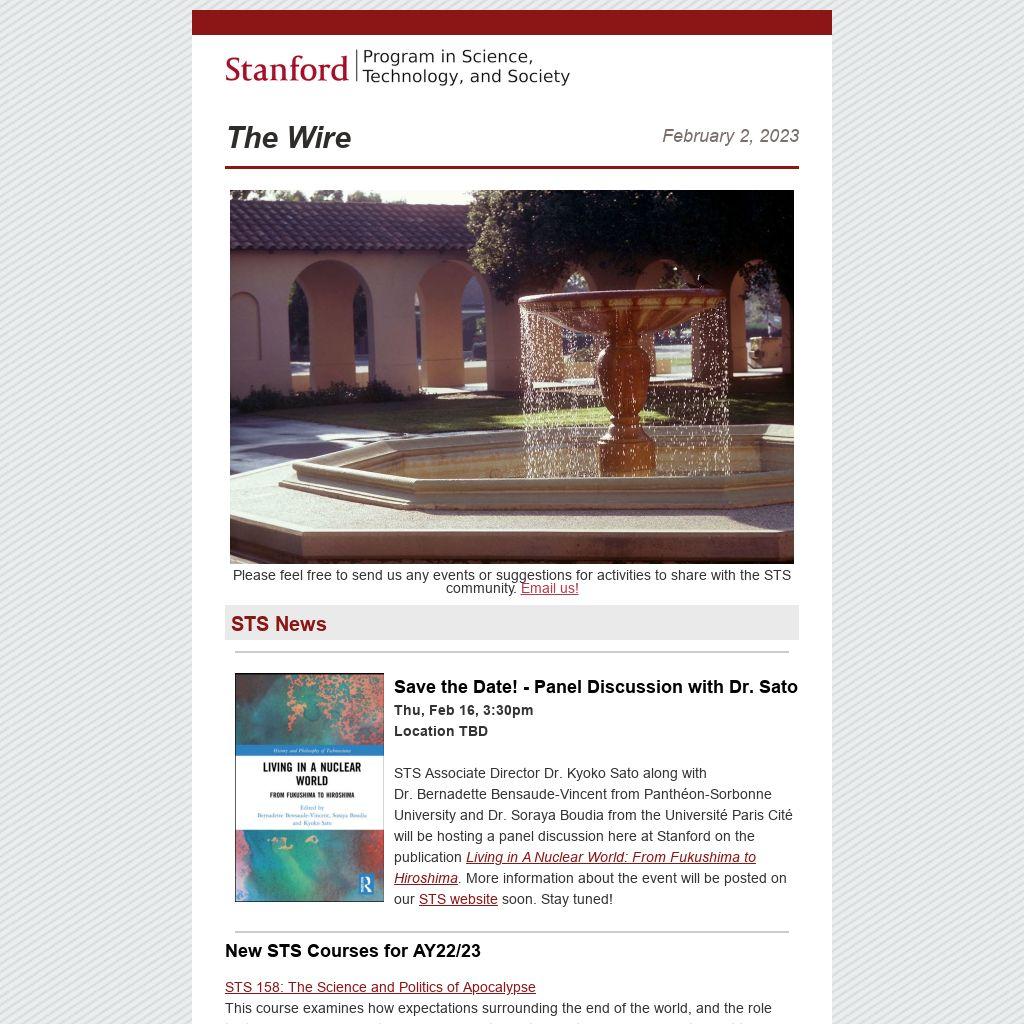 STS Associate Director Dr. Kyoko Sato along with Dr. Bernadette Bensaude-Vincent from Panthéon-Sorbonne University and Dr. Soraya Boudia from the Université Paris Cité will be hosting a panel discussion here at Stanford on the publication Living in A Nuclear World: From Fukushima to Hiroshima. More information about the event will be posted on our STS website soon. Stay tuned!