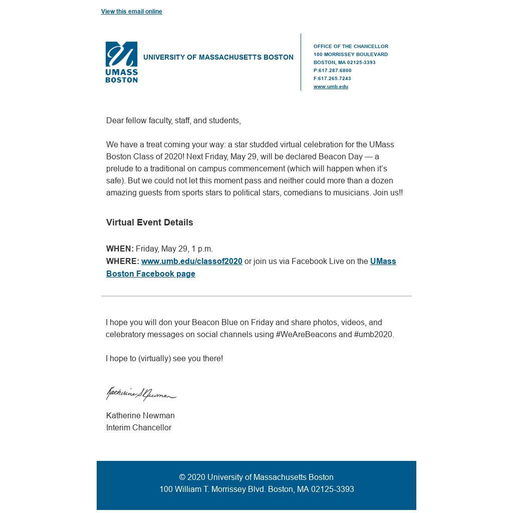 We have a treat coming your way: a star studded virtual celebration for the UMass Boston Class of 2020! Next Friday, May 29, will be declared Beacon Day — a prelude to a traditional on campus commencement (which will happen when it’s safe). But we could not let this moment pass and neither could more than a dozen amazing guests from sports stars to political stars, comedians to musicians. Join us!!