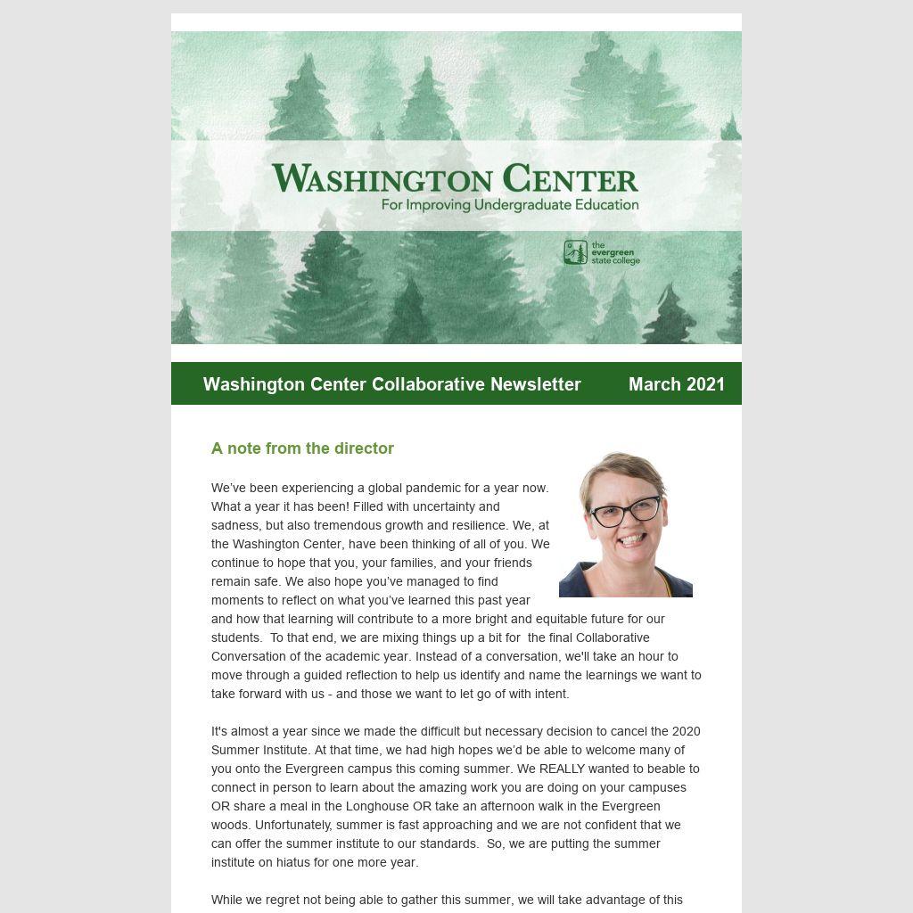 A note from the director We’ve been experiencing a global pandemic for a year now. What a year it has been! Filled with uncertainty and sadness, but also tremendous growth and resilience. We, at the Washington Center, have been thinking of all of you. We continue to hope that you, your families, and your friends remain safe. We also hope you’ve managed to find moments to reflect on what you’ve learned this past year and how that learning will contribute to a more bright and equitable future for our students. To that end, we are mixing things up a bit for the final Collaborative Conversation of the academic year. Instead of a conversation, we'll take an hour to move through a guided reflection to help us identify and name the learnings we want to take forward with us - and those we want to let go of with intent.