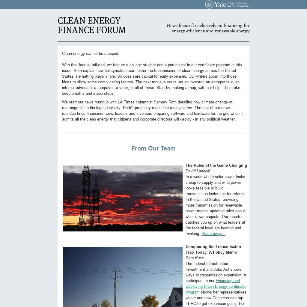 With that factual tailwind, we feature a college student and a participant in our certificate program in this issue. Both explain how policymakers can foster the transmission of clean energy across the United States. Permitting plays a role. So does sure capital for early expenses. Our writers zoom into those ideas to show some complicating factors. The next move is yours -as an investor, an entrepreneur, an internal advocate, a ratepayer, a voter, or all of these. Start by making a map, with our help. Then take deep breaths and steep steps.