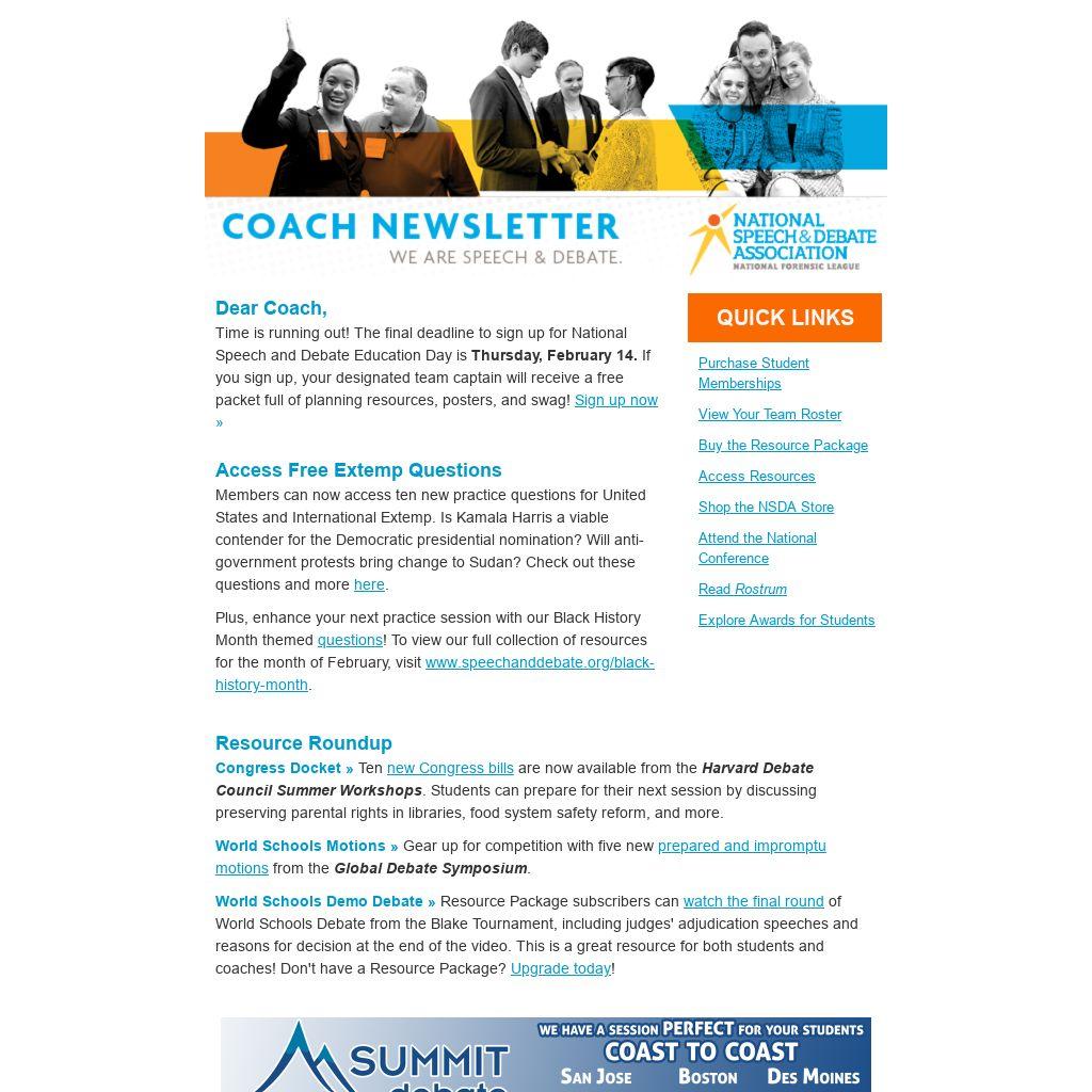 Dear Coach,Time is running out! The final deadline to sign up for National Speech and Debate Education Day is Thursday, February 14. If you sign up, your designated team captain will receive a free packet full of planning resources, posters, and swag! Sign up now »