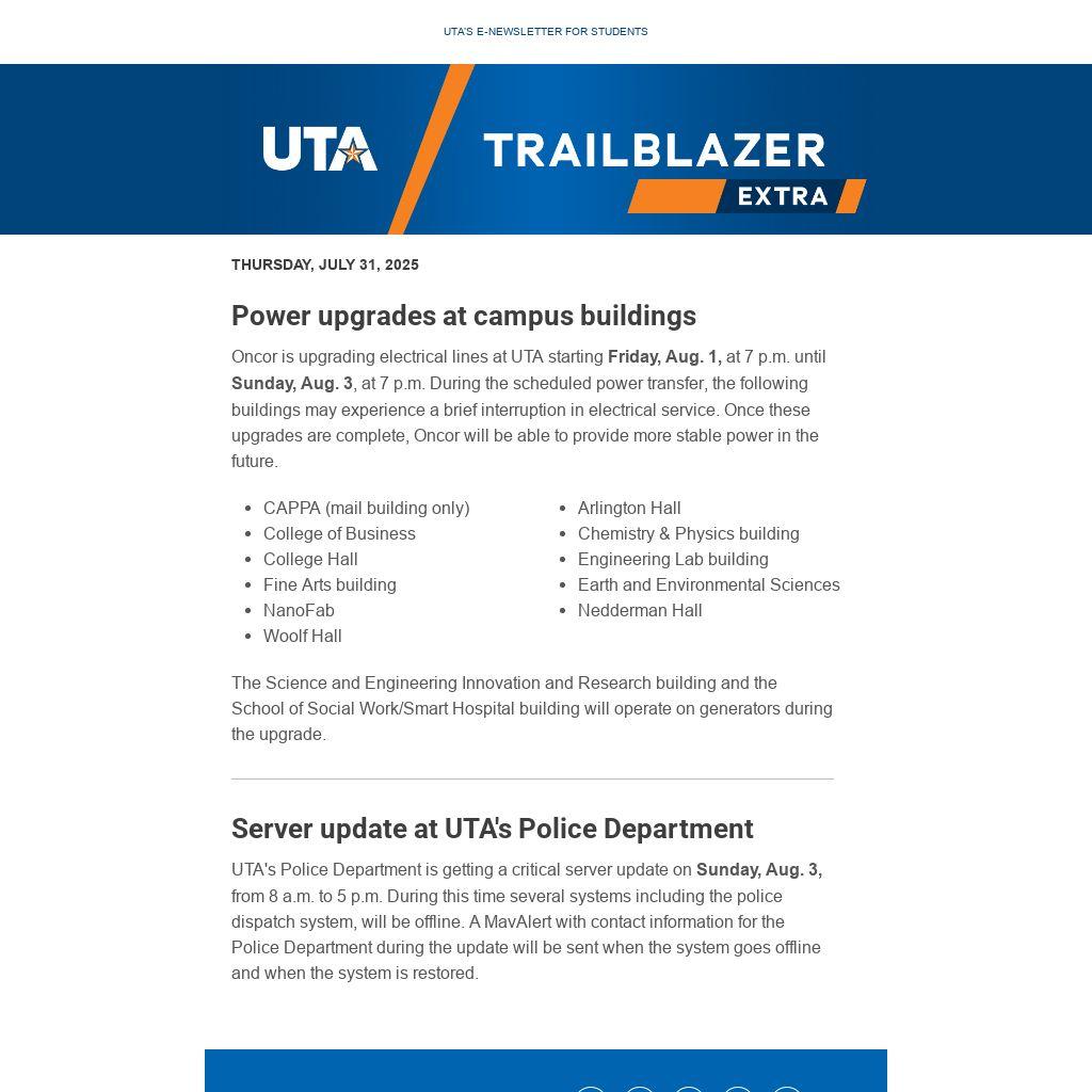 Oncor is upgrading electrical lines at UTA starting Friday, Aug. 1, at 7 p.m. until Sunday, Aug. 3, at 7 p.m. During the scheduled power transfer, the following buildings may experience a brief interruption in electrical service. Once these upgrades are complete, Oncor will be able to provide more stable power in the future.