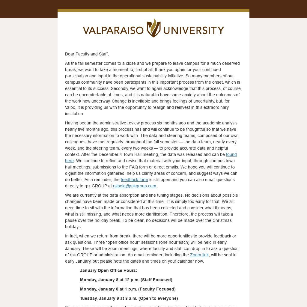 As the fall semester comes to a close and we prepare to leave campus for a much deserved break, we want to take a moment to, first of all, thank you again for your continued participation and input in the operational sustainability initiative. So many members of our campus community have been participants in this important process from the onset, which is essential to its success. Secondly, we want to again acknowledge that this process, of course, can be uncomfortable at times, and it is natural to have some anxiety about the outcomes of the work now underway. Change is inevitable and brings feelings of uncertainty, but, for Valpo, it is providing us with the opportunity to realign and reinvest in this extraordinary institution.