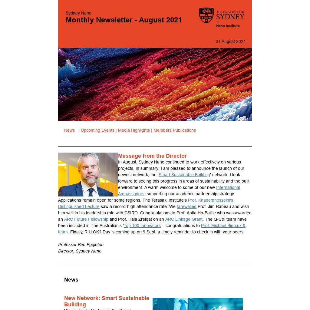 Message from the DirectorIn August, Sydney Nano continued to work effectively on various projects. In summary: I am pleased to announce the launch of our newest network, the 'Smart Sustainable Building' network. I look forward to seeing this progress in areas of sustainability and the built environment. A warm welcome to some of our new International Ambassadors, supporting our academic partnership strategy. Applications remain open for some regions. The Terasaki Institute's Prof. Khademhosseini's Distinguished Lecture saw a record-high attendance rate. We farewelled Prof. Jim Rabeau and wish him well in his leadership role with CSIRO. Congratulations to Prof. Anita Ho-Baillie who was awarded an ARC Future Fellowship and Prof. Hala Zreiqat on an ARC Linkage Grant. The Q-Ctrl team have been included in The Australian's 'Top 100 Innovators' - congratulations to Prof. Michael Biercuk & team. Finally, R U OK? Day is coming up on 9 Sept, a timely reminder to check in with your peers.