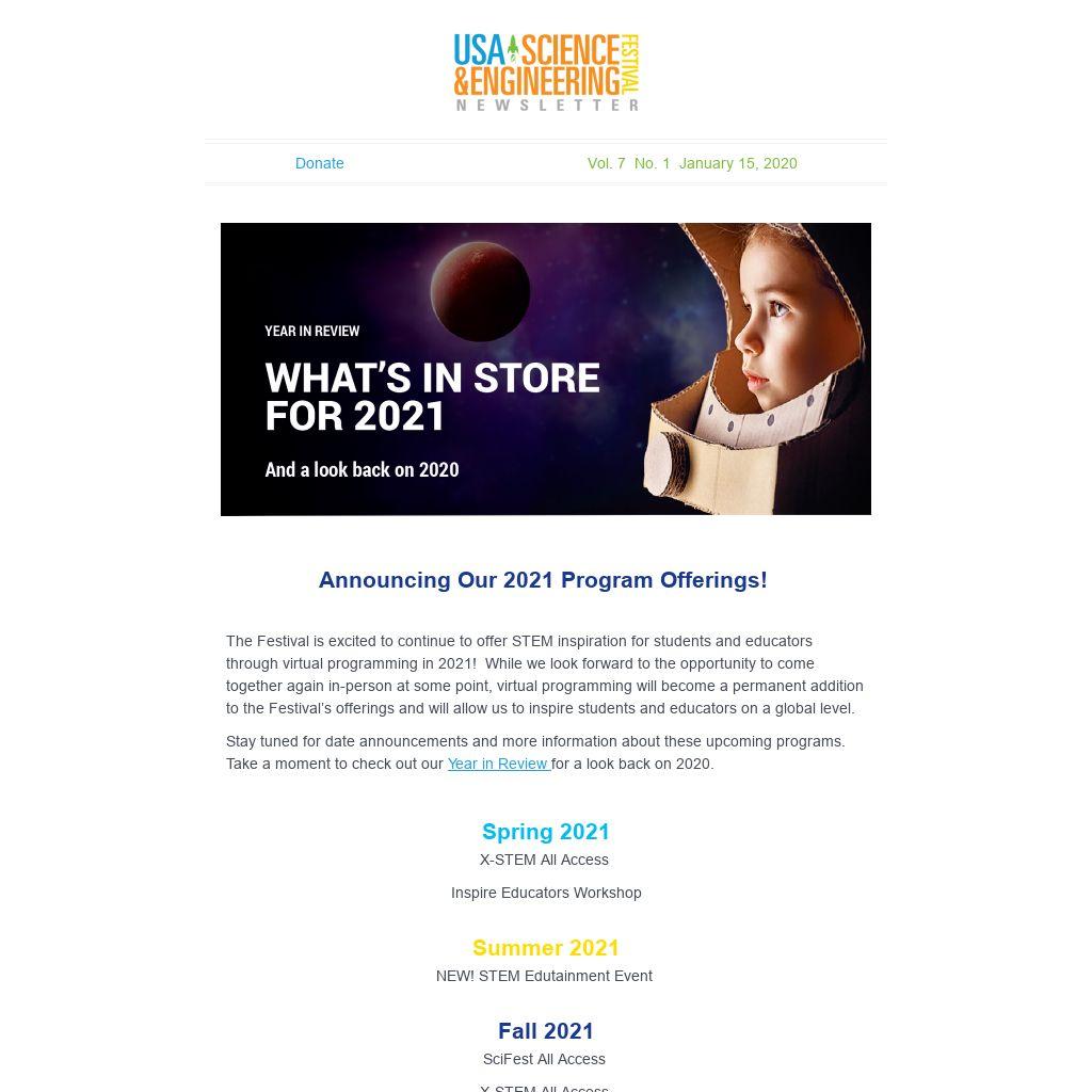 The Festival is excited to continue to offer STEM inspiration for students and educators through virtual programming in 2021! While we look forward to the opportunity to come together again in-person at some point, virtual programming will become a permanent addition to the Festival’s offerings and will allow us to inspire students and educators on a global level.