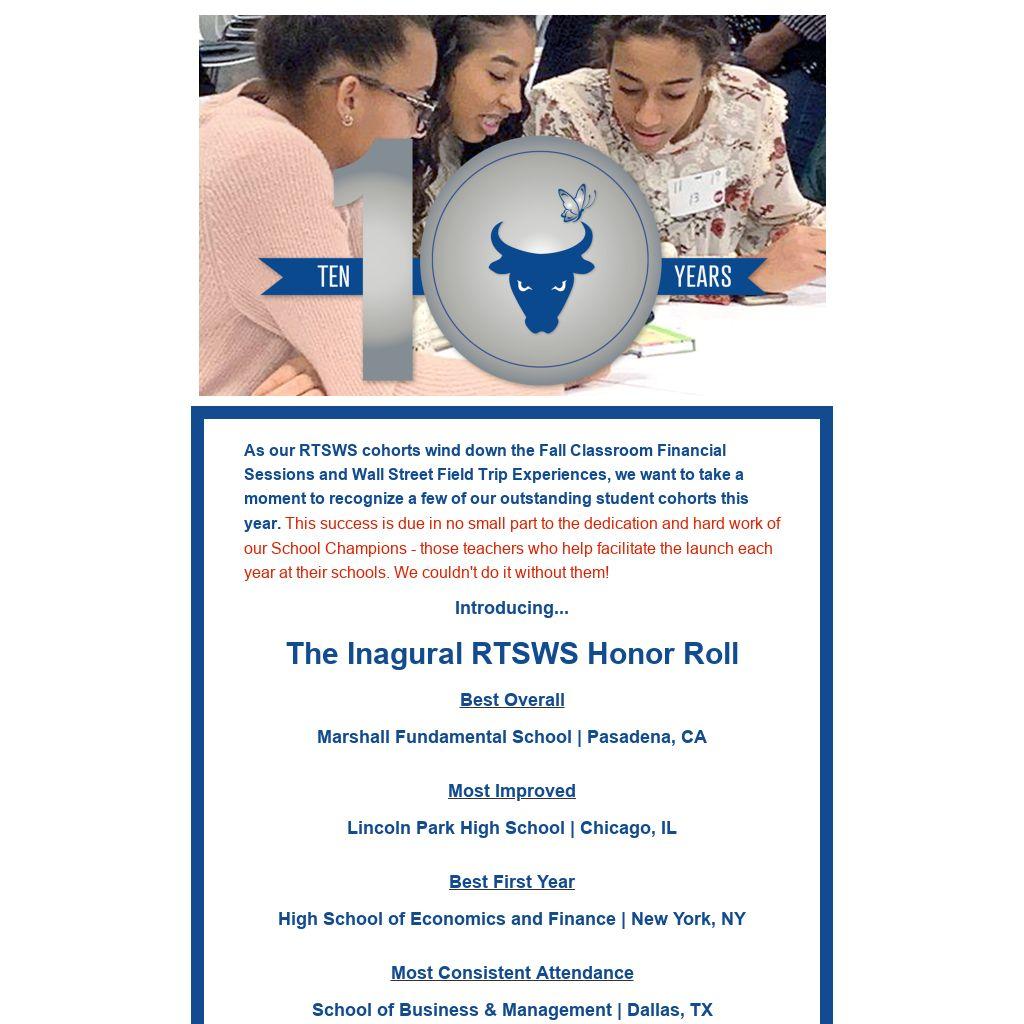 As our RTSWS cohorts wind down the Fall Classroom Financial Sessions and Wall Street Field Trip Experiences, we want to take a moment to recognize a few of our outstanding student cohorts this year. This success is due in no small part to the dedication and hard work of our School Champions - those teachers who help facilitate the launch each year at their schools. We couldn't do it without them!