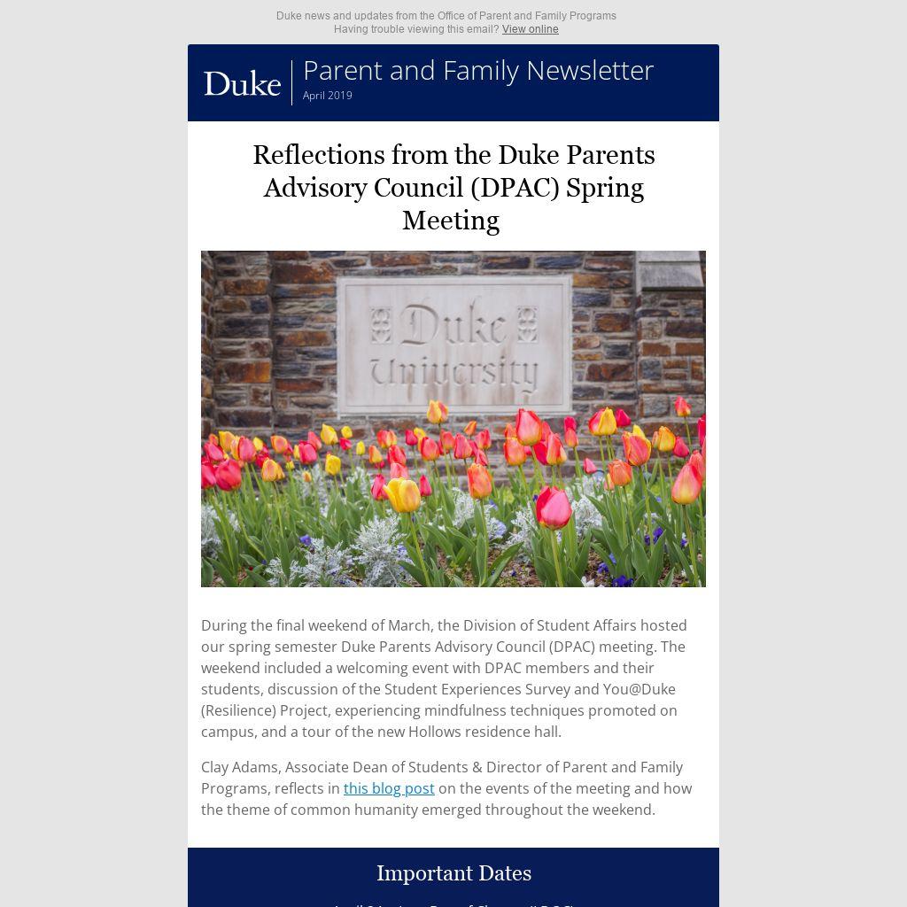 During the final weekend of March, the Division of Student Affairs hosted our spring semester Duke Parents Advisory Council (DPAC) meeting. The weekend included a welcoming event with DPAC members and their students, discussion of the Student Experiences Survey and You@Duke (Resilience) Project, experiencing mindfulness techniques promoted on campus, and a tour of the new Hollows residence hall.