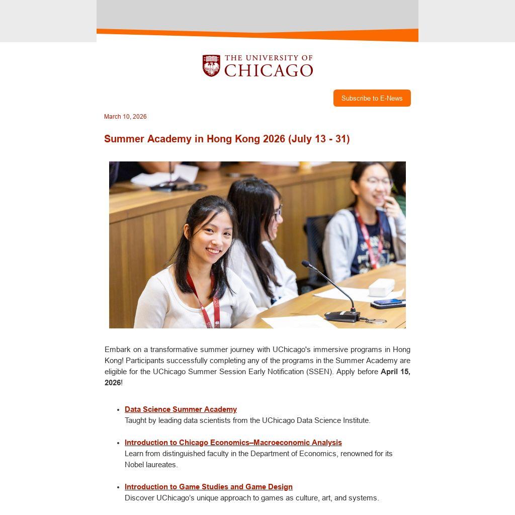 The Graduate Student at Large programs offer qualified international students the opportunity to study graduate-level courses on the UChicago’s main campus with a J-1 visa. Students learn alongside UChicago master’s and doctoral students, engaging with distinguished faculty and earn an official transcript with personalized advising.