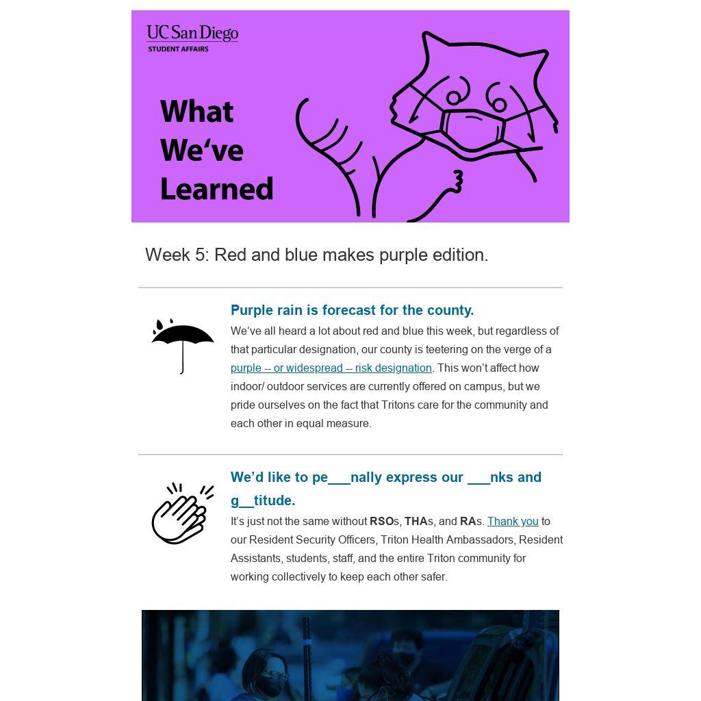 We’ve all heard a lot about red and blue this week, but regardless of that particular designation, our county is teetering on the verge of a purple -- or widespread -- risk designation. This won’t affect how indoor/ outdoor services are currently offered on campus, but we pride ourselves on the fact that Tritons care for the community and each other in equal measure.
