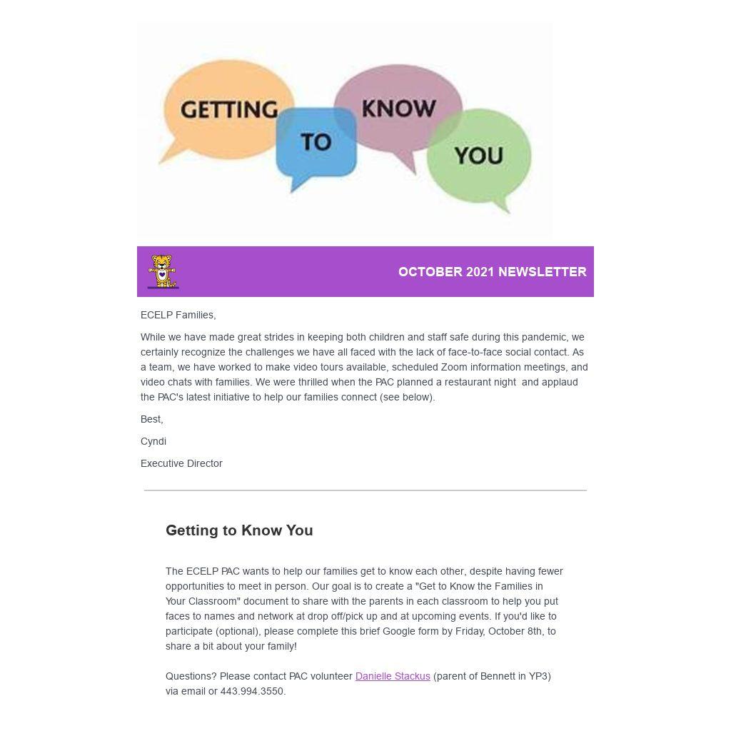 While we have made great strides in keeping both children and staff safe during this pandemic, we certainly recognize the challenges we have all faced with the lack of face-to-face social contact. As a team, we have worked to make video tours available, scheduled Zoom information meetings, and video chats with families. We were thrilled when the PAC planned a restaurant night and applaud the PAC's latest initiative to help our families connect (see below).
