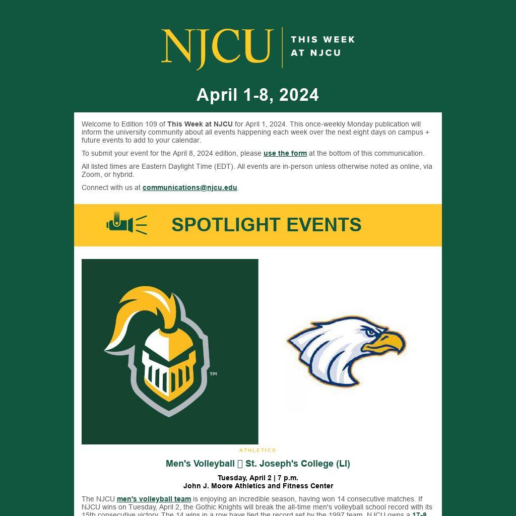 Welcome to Edition 109 of This Week at NJCU for April 1, 2024. This once-weekly Monday publication will inform the university community about all events happening each week over the next eight days on campus + future events to add to your calendar.