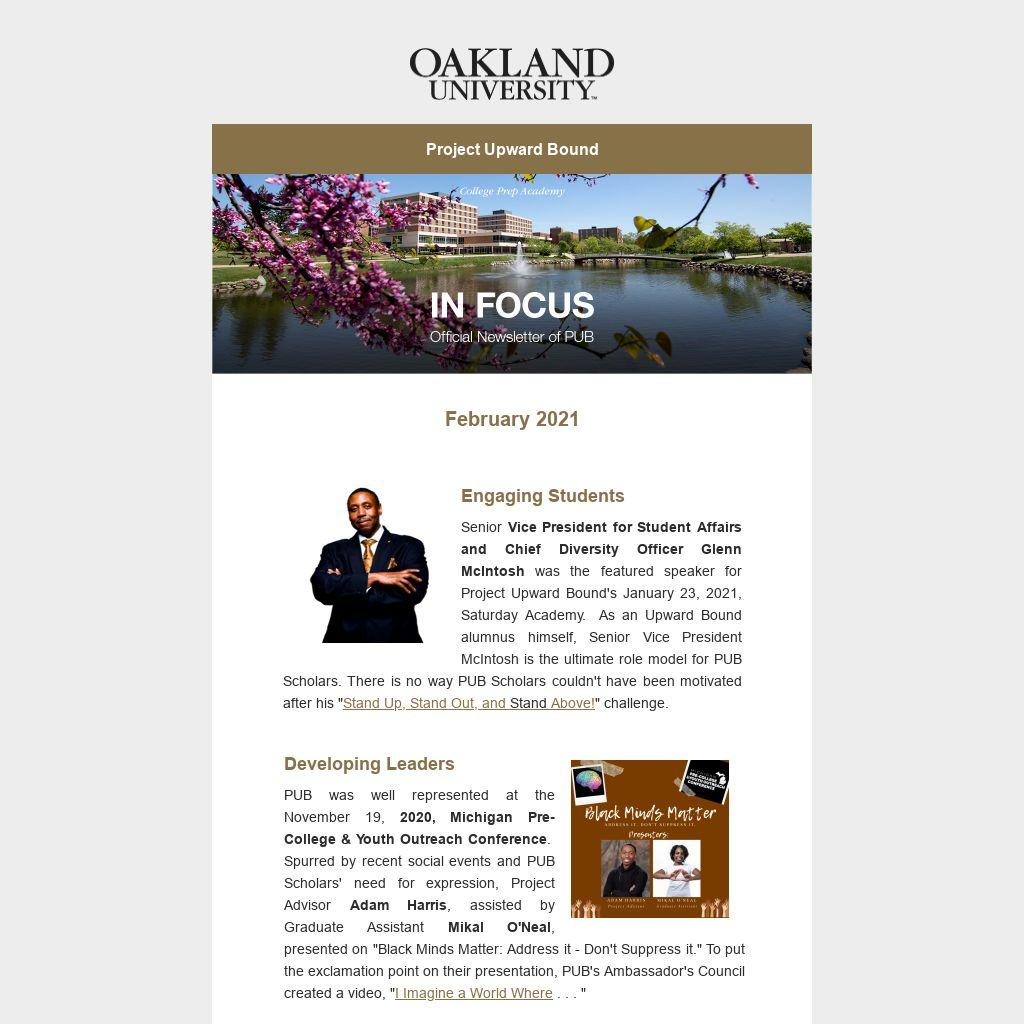 Moving forward, PUB will continue to take its cues from OU and remain virtual throughout the 2021 summer in anticipation of facilitating hybrid services beginning in fall 2021. Until then, stay informed about PUB on our web site, www.oakland.edu/upwardbound, and through our social media outlets: