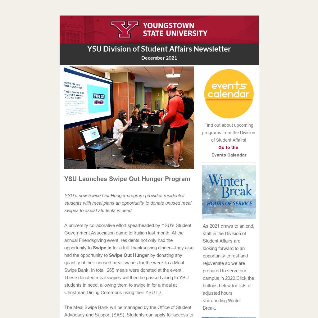 In 2016, YSU Student Government Association established the SGA Food Pantry to support students facing food insecurity. In 2020, SGA joined forces with Student Advocacy and Support to expand the services of the pantry, providing critical support to students during the pandemic. In collaboration, the two departments are able to provide year-round support through this service, now known as the Penguin Pantry. Swipe Out Hunger is the next step in providing ongoing support to YSU students. Questions about the Penguin Pantry or Swipe Out Hunger can be directed to Nicholas Koupiaris, Student Government Association President (nakoupiaris@student.ysu.edu) or Dean of Students Dr. Nicole Kent-Strollo (nkentstrollo@ysu.edu).