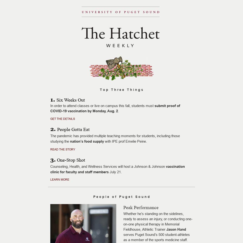 Whether he’s standing on the sidelines, ready to assess an injury, or conducting one-on-one physical therapy in Memorial Fieldhouse, Athletic Trainer Jason Hand serves Puget Sound’s 500 student-athletes as a member of the sports medicine staff. Originally from the East Coast, Hand fell in love with the Pacific Northwest while attending grad school in Oregon. Since 2012, he’s helped Loggers participating in sports through injury evaluation, rehabilitation, and preventative care. The most rewarding part of his job is seeing an injured athlete overcome physical and mental barriers to get back to the activities they enjoy. When he isn’t working with patients, Hand likes to be outdoors, hiking, camping, snowboarding, bicycling, or golfing.