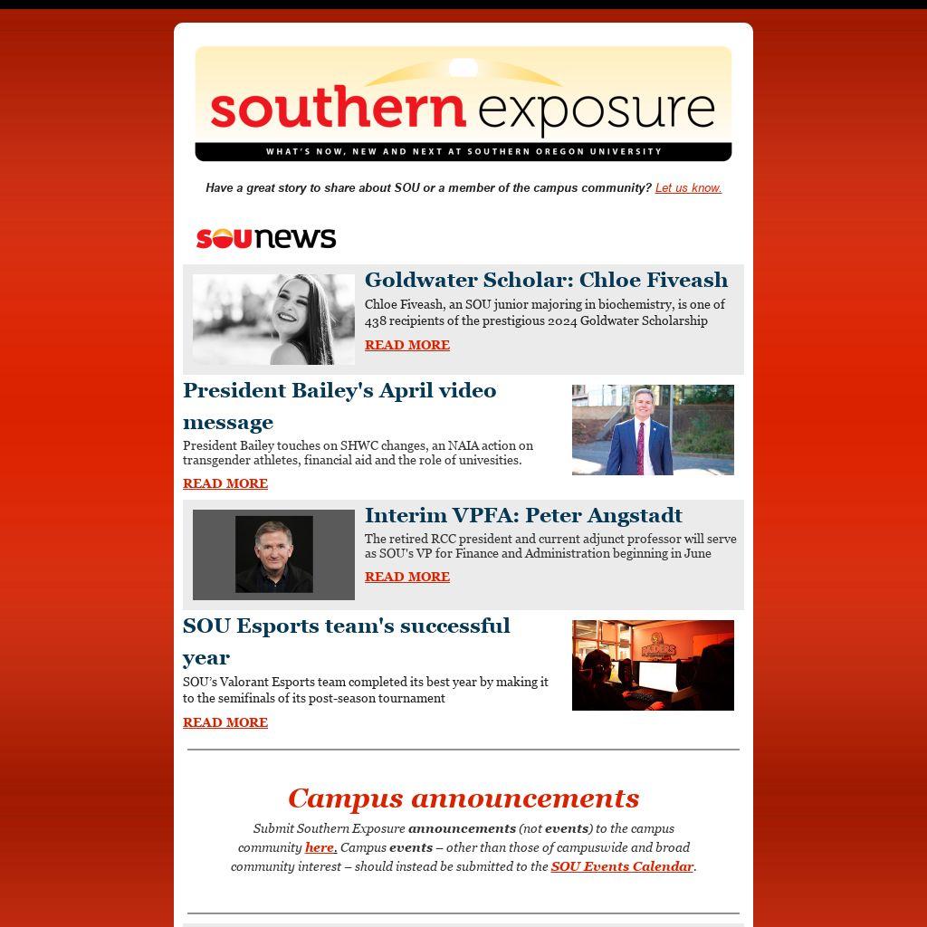 Submit Southern Exposure announcements (not events) to the campus community here. Campus events – other than those of campuswide and broad community interest – should instead be submitted to the SOU Events Calendar.