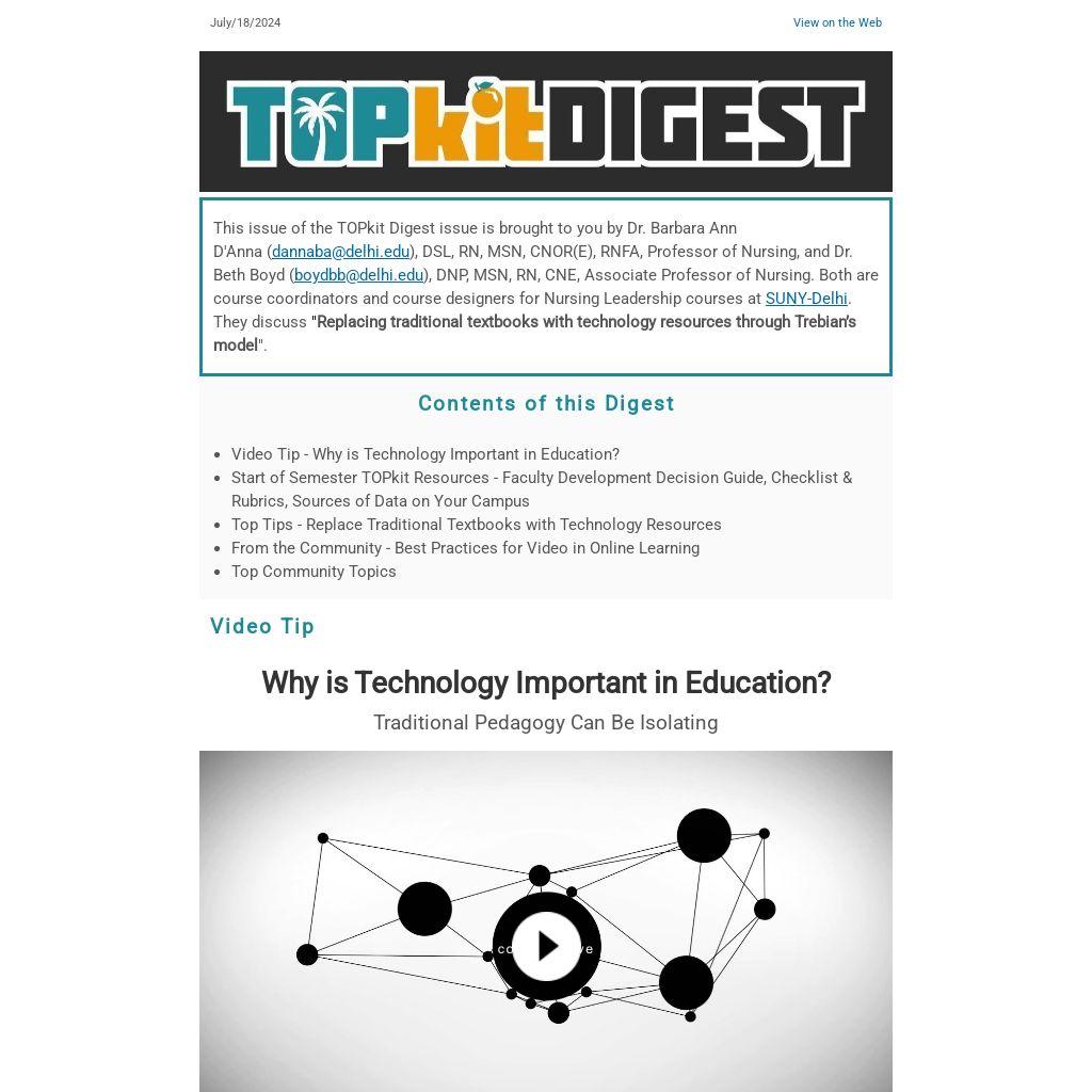 This issue of the TOPkit Digest issue is brought to you by Dr. Barbara Ann D'Anna (dannaba@delhi.edu), DSL, RN, MSN, CNOR(E), RNFA, Professor of Nursing, and Dr. Beth Boyd (boydbb@delhi.edu), DNP, MSN, RN, CNE, Associate Professor of Nursing. Both are course coordinators and course designers for Nursing Leadership courses at SUNY-Delhi. They discuss "Replacing traditional textbooks with technology resources through Trebian’s model".