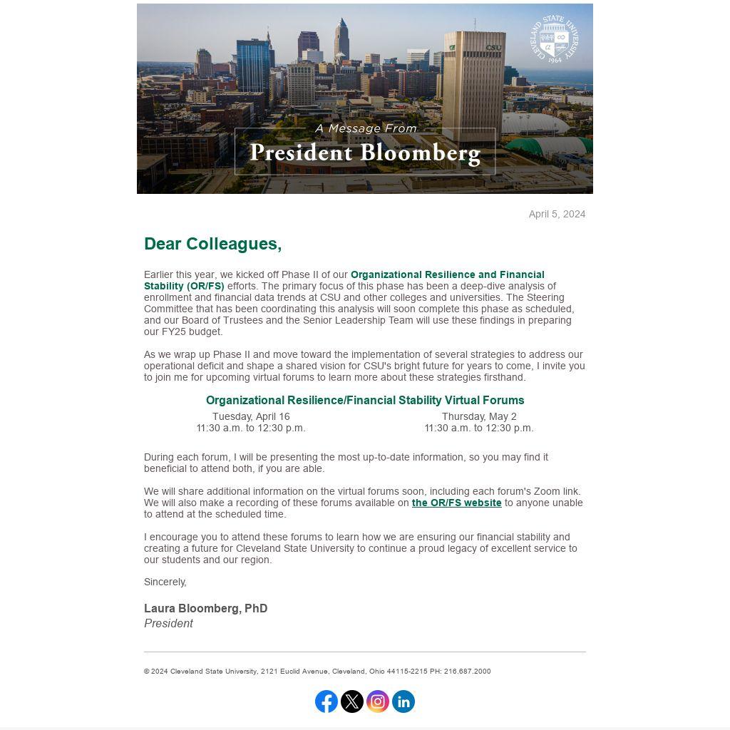 I encourage you to attend these forums to learn how we are ensuring our financial stability and creating a future for Cleveland State University to continue a proud legacy of excellent service to our students and our region.