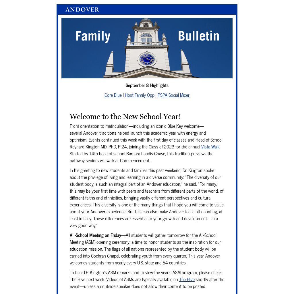 We look forward to welcoming families back to campus in just a few weeks! Family Weekend, October 14–16, provides a unique glimpse into your child’s daily life at Andover, with activities such as classroom visits with your child’s instructors, student performances, and athletic events. Registration is now open!