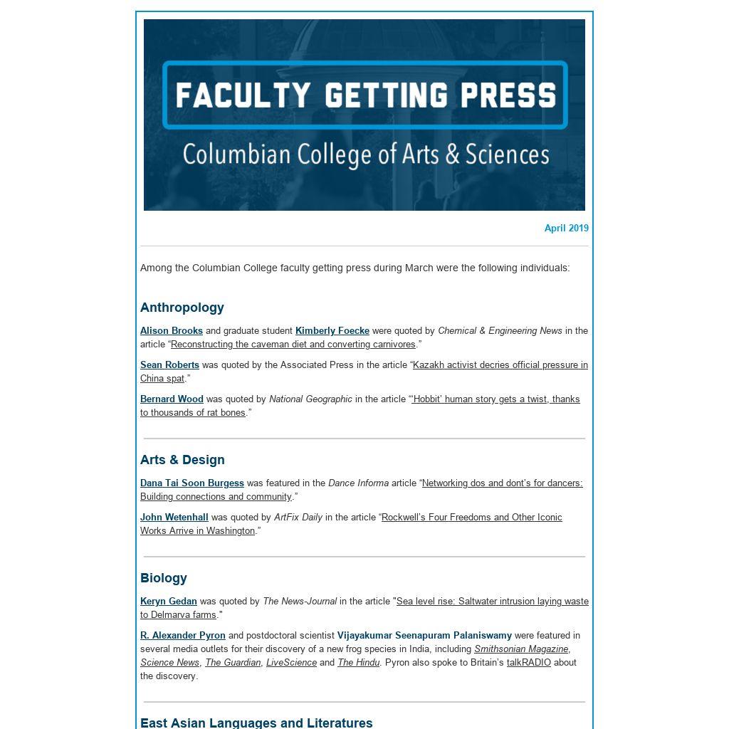 Among the Columbian College faculty getting press during March were the following individuals: