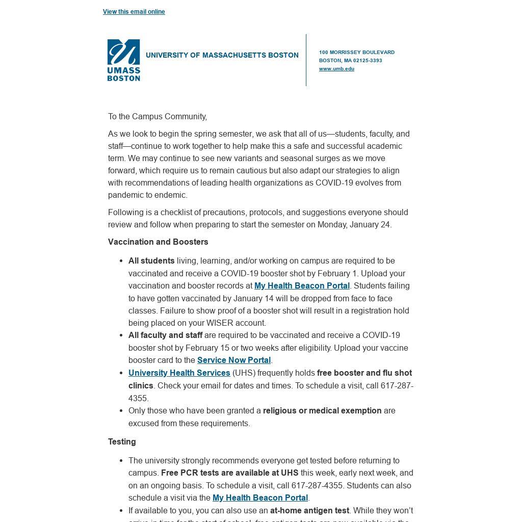 As we look to begin the spring semester, we ask that all of us—students, faculty, and staff—continue to work together to help make this a safe and successful academic term. We may continue to see new variants and seasonal surges as we move forward, which require us to remain cautious but also adapt our strategies to align with recommendations of leading health organizations as COVID-19 evolves from pandemic to endemic.