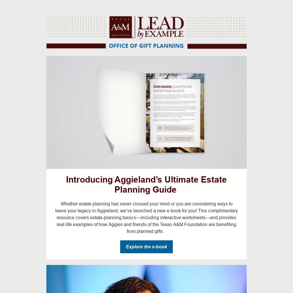 Whether estate planning has never crossed your mind or you are considering ways to leave your legacy in Aggieland, we’ve launched a new e-book for you! This complimentary resource covers estate-planning basics—including interactive worksheets—and provides real-life examples of how Aggies and friends of the Texas A&M Foundation are benefiting from planned gifts.